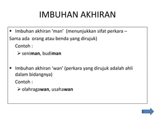 Imbuhan yang biasanya digunakan untuk membentuk kata kerja seperti me- mem- ber- per- ter- di -kan ter-kan dan di-i. 1Anak kesayangan Mak Minah akan berlepas ke England untuk melanjutkan pelajarannya. Imbuhan penerangan contoh awalan imbuhan yang diletakkan di hadapan kata dasar ber- di- ke- men- pen- pe-per- se- ter- awalan rangkap imbuhan rangkap yang diletakkan di hadapan kata dasar diper- memper- akhiran imbuhan yang diletakkan di belakang kata dasar -an -i.